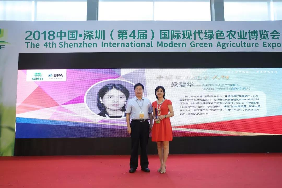 德庆县组织18家优秀农业企业,共带来了紫淮山、巴戟、何首乌、广佛手、肉桂等50多种产品。展会上,德庆展区人潮涌动,吸引了众多客商前来洽谈采购。德庆县双华食品厂(董事长)梁碧华女士更是以其不忘乡恩,帮助乡民脱贫致富这一善举,被组委会评为“2018中国十大农业风云人物”。
