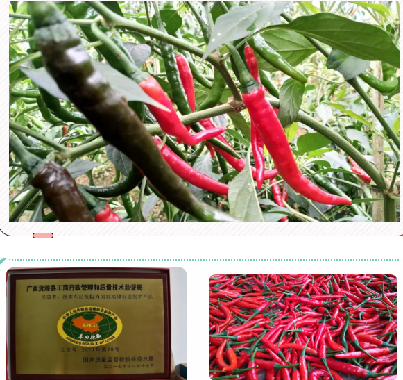 辣椒中含有丰富的维生素、膳食纤维和人体所需的矿物质。资源辣椒具有健胃消食,预防胆结石,改善心脏功能预防心血管疾病的功效。辣椒在资源县种植与食用历史悠远,人们常用来开胃消食增进食欲,暖胃驱寒除风发汗,是资源人每餐必备的佳肴。资源辣椒,皮薄肉厚,幼嫩时采摘谓之青椒,青翠欲滴,常伴五花肉清炒,辣中带甜让人胃口大开;成熟后采摘谓之红椒,娇艳似火,至于泡菜坛中月余后,清脆爽口,从舌尖就能感觉到,全身的血液循环;红椒除去水份后谓之干红椒,红得发紫,薄若镜面果皮,包裹的辣椒素娇艳欲滴,是干炒拌料的佳品。
