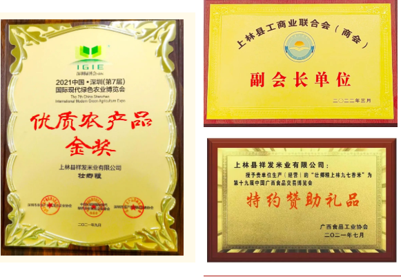 公司秉承“健康、传承、专注、创新”文化的理念以及“泉育上林稻,好米祥发造”的品牌口号,努力打造本土稻米领导品牌。目前公司“韦氏祥发”、“壮鄉粮”、“壮厨娘”、“恏水源”等系列大米产品,深受消费者信赖和喜爱,销售网点辐射广西区内外,享有广泛的知名度,是《南宁市农业产业化重点龙头企业》、《广西上林农业科技园区——大米加工示范基地》、《上林县工商联合会(商会)副会长单位》、《第八届广西食品工业协会会员单位》、《上林县诚信经营放心消费创建单位》,近年来获得《富硒农产品认定》、《2021年优秀供应商奖》、壮鄉粮品牌获得2021中国·深圳(第7届)国际现代绿色农业博览会优质农产品金奖、壮鄉粮系列产品为(第十九届)广西食品交易博览会特约赞助礼品等荣誉和资质。