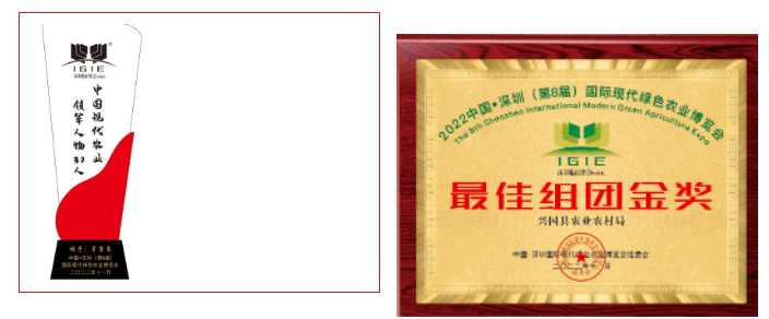 绿博会上,江西国康农业集团有限公司董事长茅赛赛荣获“中国现代农业领军人物”称号,兴国县农业农村局荣获“最佳组团金奖”。
